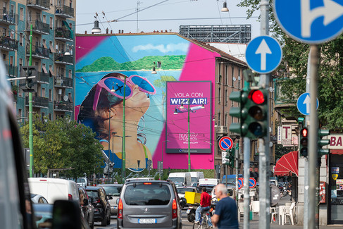 Il s'agit de la première des deux peintures murales réalisées à Milan pour la compagnie aérienne Wizzair, qui dessert jusqu'à 26 aéroports italiens et plusieurs routes européennes. Au cœur de NoLo, nous avons créé une œuvre qui joue sur les destinations de vacances, aux couleurs de la livrée de la compagnie hongroise. Il s'agit d'une peinture murale de plus de 400 mètres carrés, où la technique hyperréaliste de Mate sur le visage de la jeune fille joue avec le contraste des fonds picturaux.